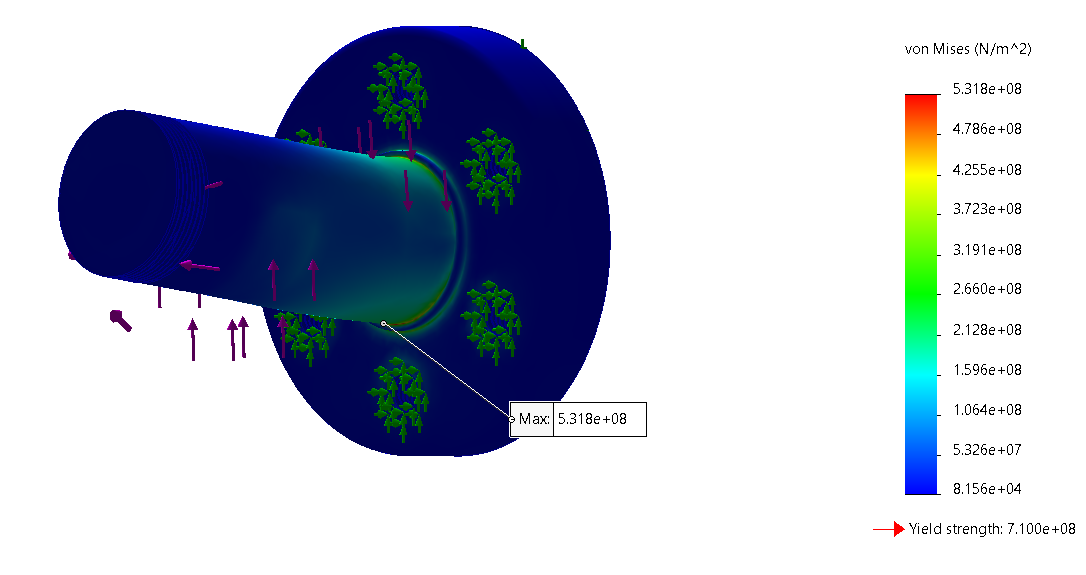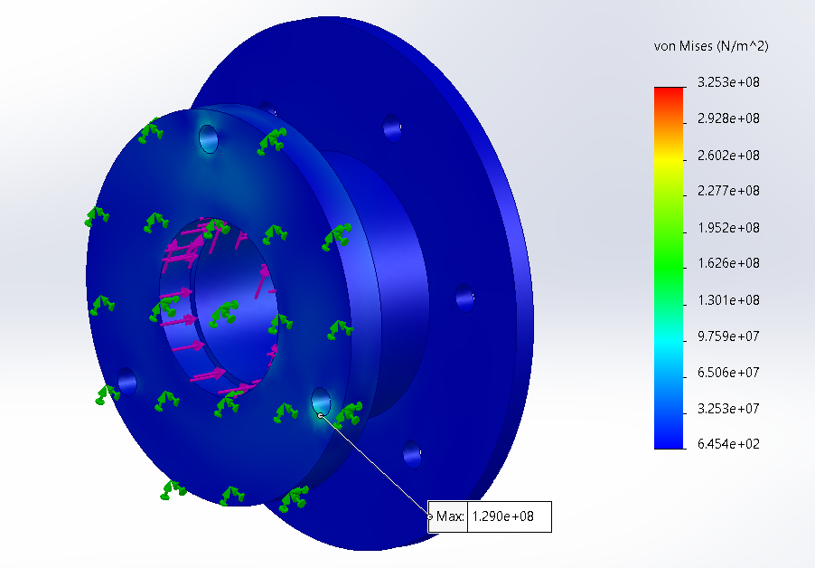 Conducted linear static FEA simulations on the spindle and wheel hub to validate structural integrity. Using SolidWorks FEA to simulate the static, acceleration, and breaking cases. Using the findings to identify areas for weight reduction and to manage local maximum stress.