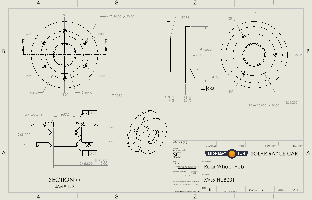 Created engineering drawings for the rear wheel hub assembly using ordinate dimensioning and GD&T, to communicate design intent and ensure manufacturability.